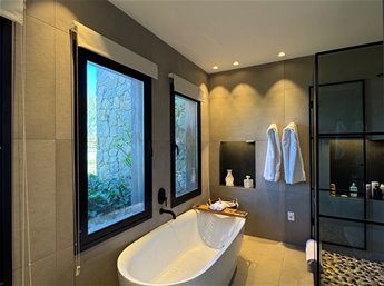 El área privada se compone de 4 dormitorios en suite, todos de gran tamaño y con acceso al jardín. La suite principal destaca por su vista, dimensiones y su baño en suite con ducha y bañera.
