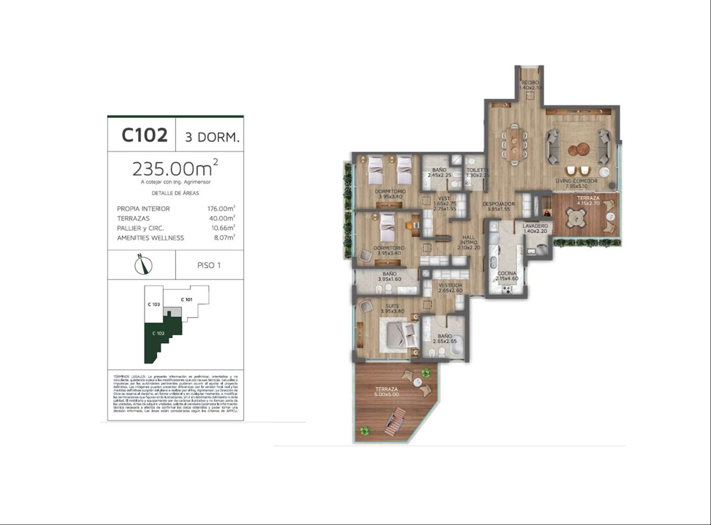 Amplio 3 dormitorios 176 metros internos y 235 metros totales. Ambientes amplios con las más finas terminaciones, iluminación natural y detalles pensados para obtener la disposición más eficiente en términos de espacio y prestaciones.. Lujo y comodidad de un hotel 5 estrellas.