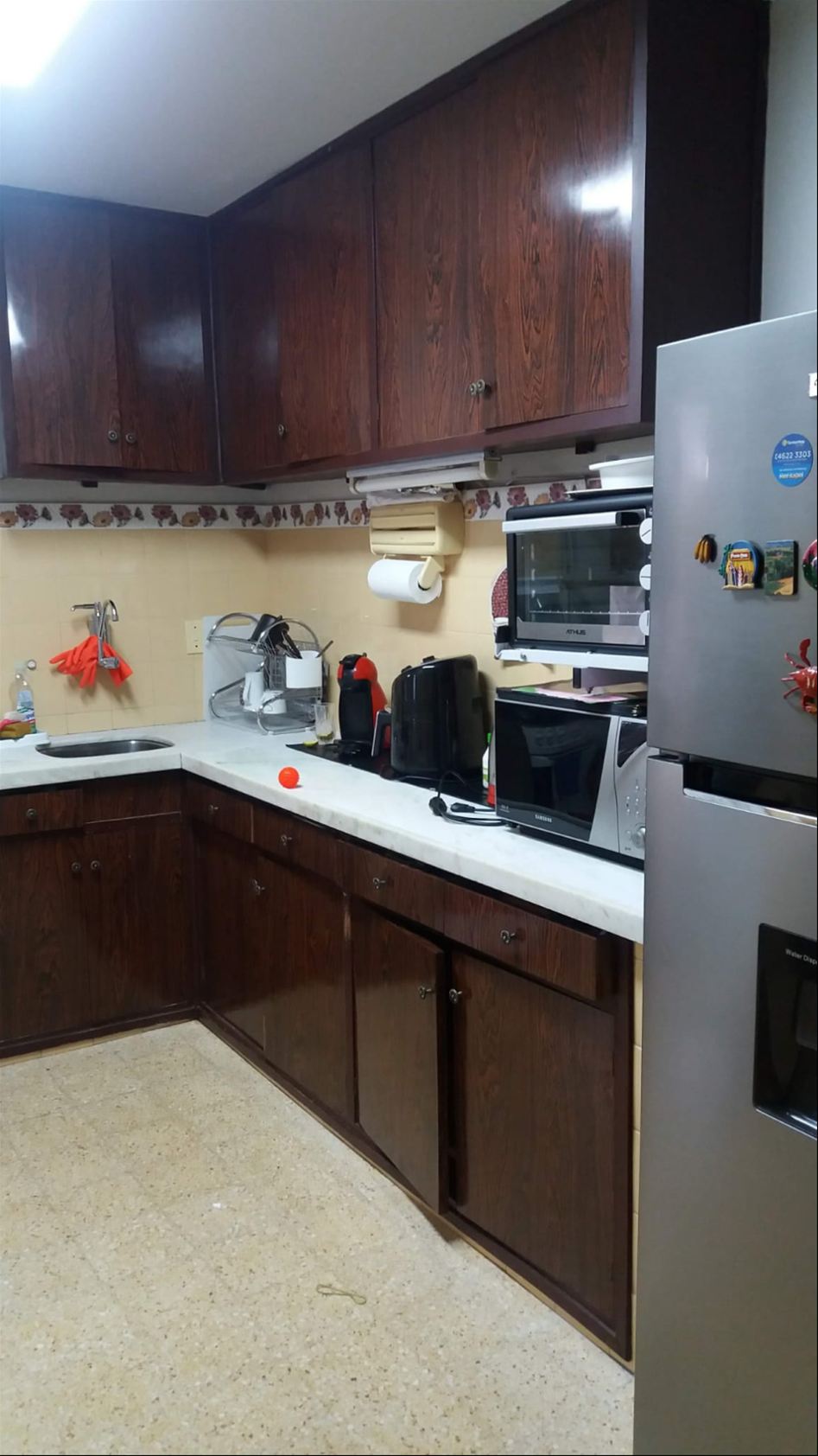Cocina completa, con muebles bajo y sobre mesada y grifería monocomando.