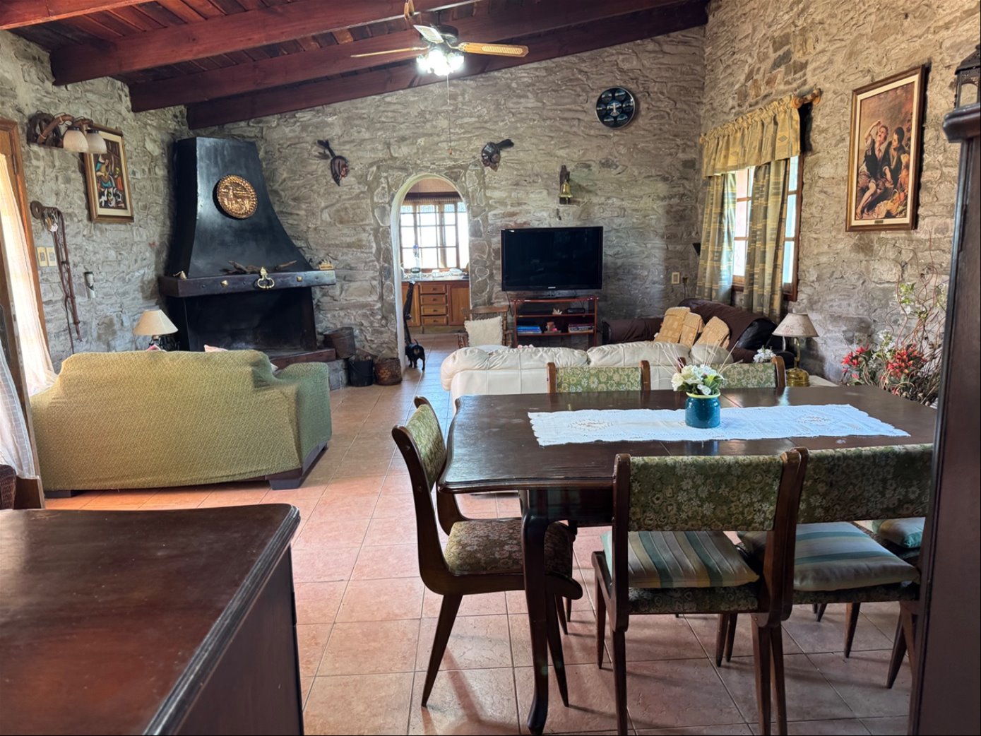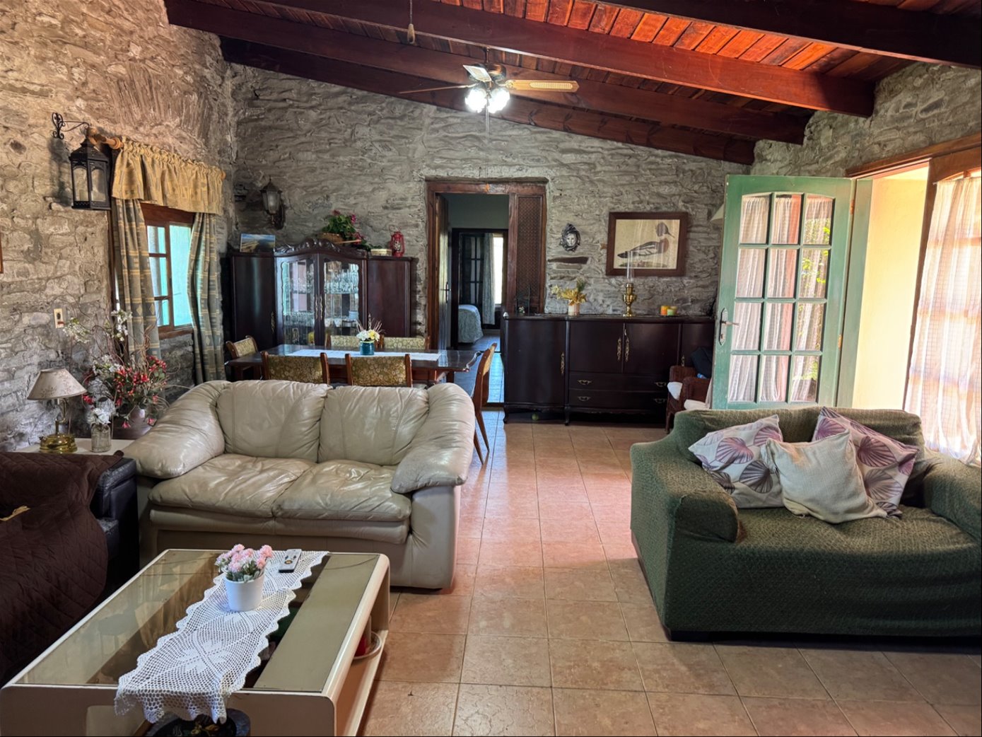Amplio y comodo living comedor con hermosa estufa a leña con salida al alero y jardín del medio con hermosas vistas.