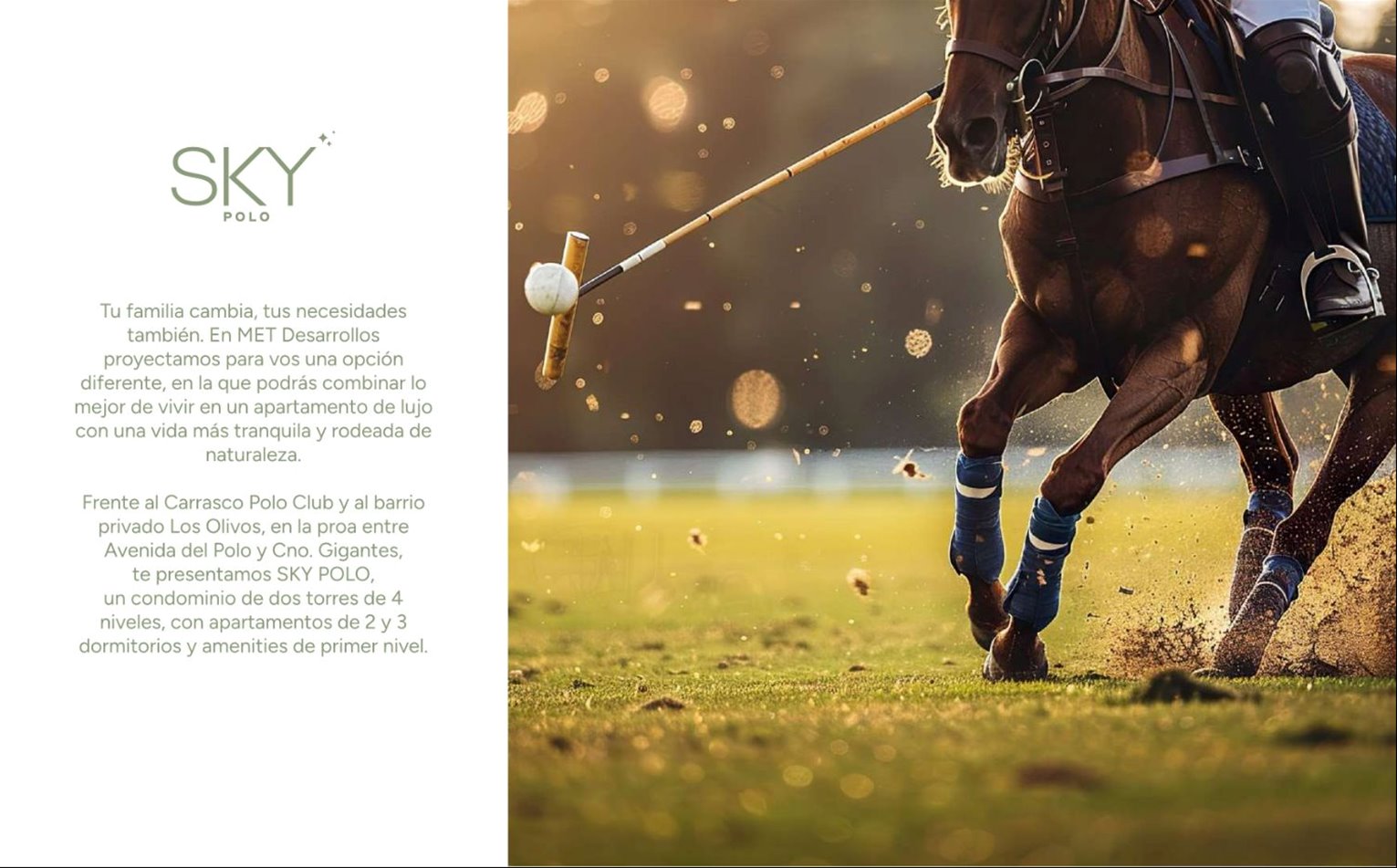 CARRASCO NORTE- SKY POLO / PROYECTO DE CATEGORIA EN MUY BUENA UBICACION, EN UN ENTORNO DE NATURALEZA, FRENTE A LAS CAHCHAS DEL POLO CLUB Y A POCOS MUNUTOS DEL CENTRO DE CARRASCO / Entrega de unidades: Julio 2027Propuestas arquitectónicas innovadoras a la par de una excelente calidad constructiva,Las unidades se destacan por su amplitud, sus amplios ventanales, vistas despejadas, finas terminacionesPRE-VENTA A PRECIOS PROMOCIONALES!Todas las unidades cuentan con amplias terrazas y parrillero propioTIPOLOGIAS: * 2 Dormitorios de 91m2 + 14m2 de terrazas desde USD404.300-* 3 Dormitorios de 127m2 + 44m2 de terrazas desde USD538.000-Garajes desde USD25.000-Gastos de ocupación: 5%Comisión inmobiliaria: 3%+IVAAMENITIES: * Piscina exterior climatizada* Solarium* Barbacoa con parrillero * Sauna* Zona de juegos para niñosFINANCIACION PROPIA DURANTE LA OBRA HASTA LA ENTREGAFORMA DE PAGO:Reserva: 10%Compromiso: 30%Saldo del 60%: en cuotas durante la obra hasta la entrega de la unidad-Por consultas y coordinación de visitas favor enviar mensaje vía WhatsApp o llamar al celular de contacto-