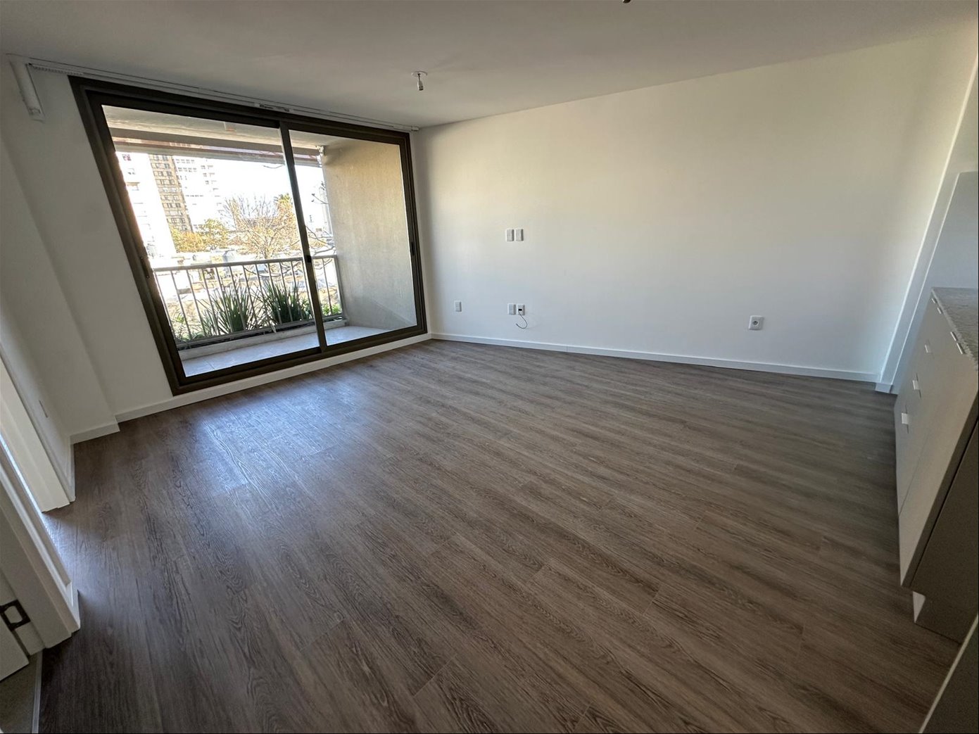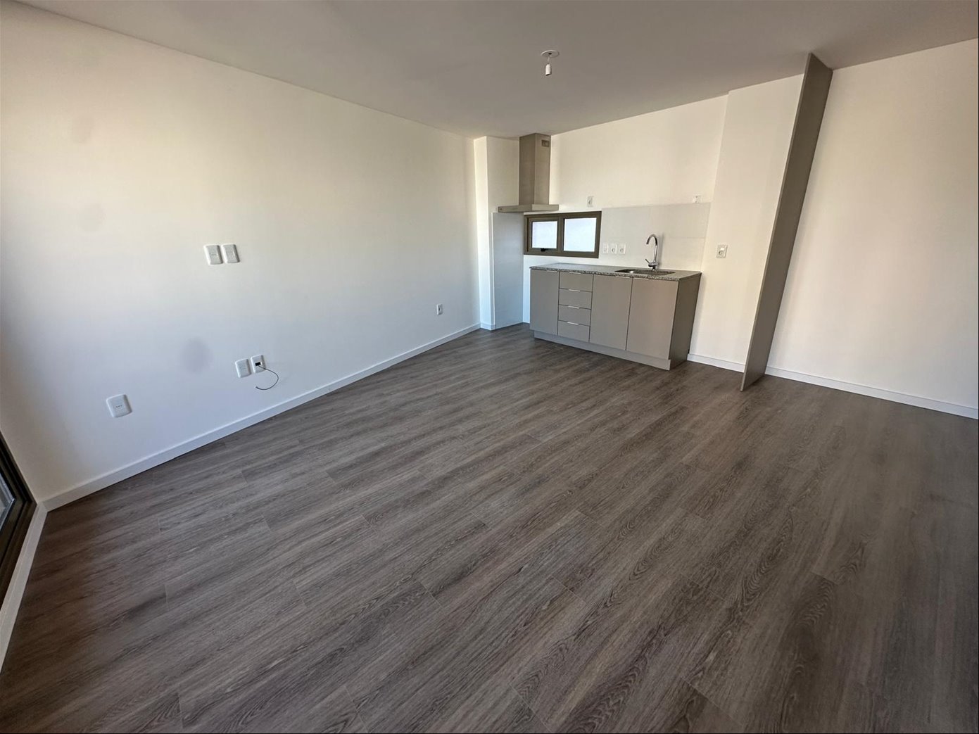 Living comedor con salida a terraza, cocina integrada con muebles aéreos y bajo mesada