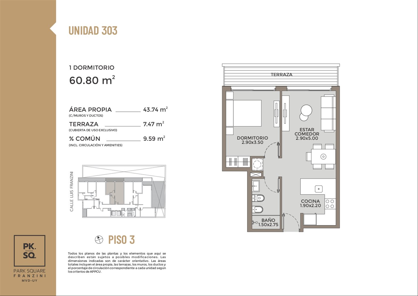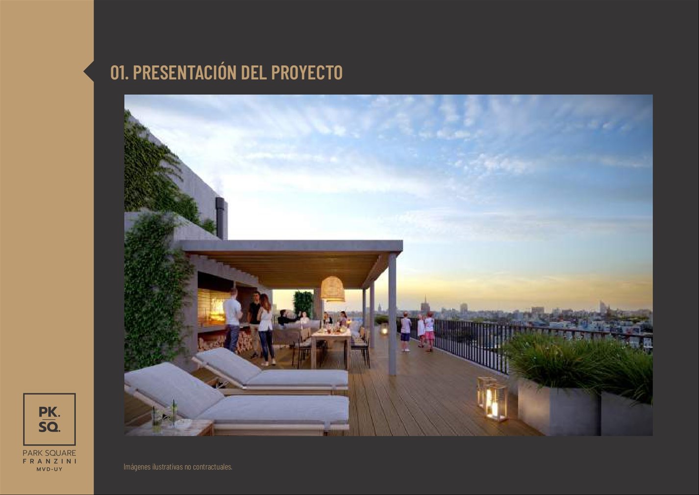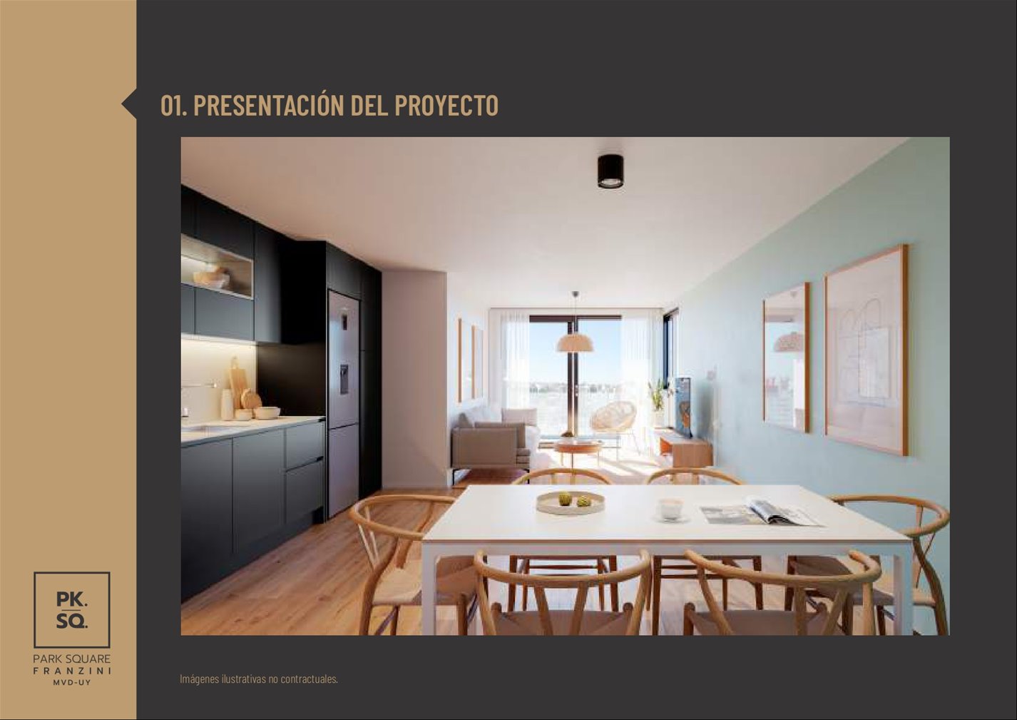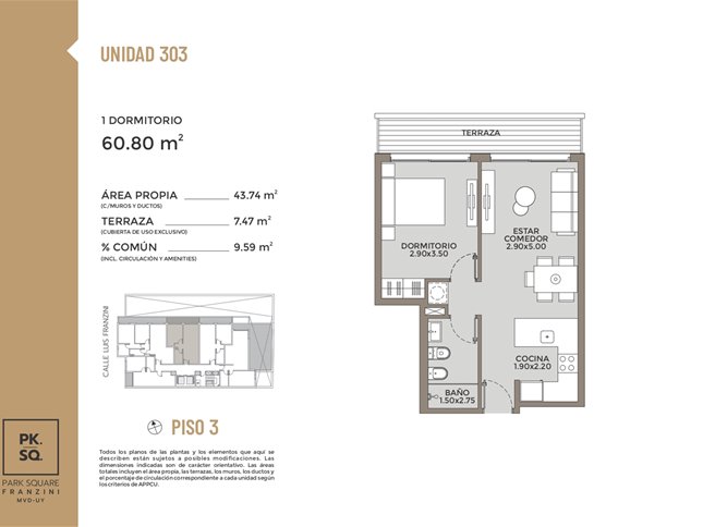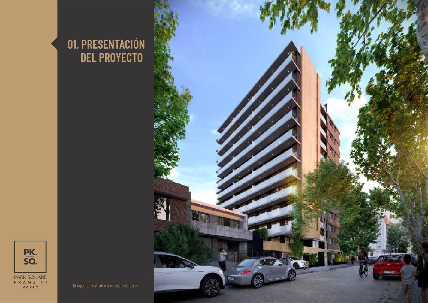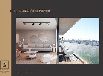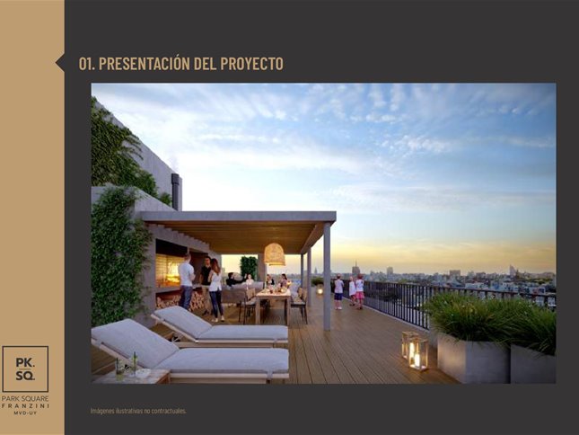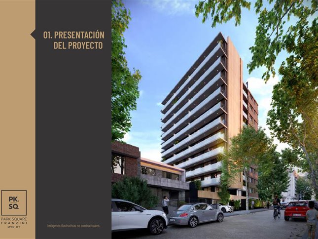 PARK SQUARE FRANZINI: Es un edificio de arquitectura moderna que saca el máximo partido de su excelente orientaciónSe desarrolla en una torre de 11 pisos con 57 apartamentos de 1 y 2 dormitorios.Características de las unidades: vidrio dobles en sus aberturas y con terrazas, paredes interiores entre unidades son de mampostería de mampuesto tradicional, cocinas se entrega con campana extractora, anafe vitrocerámico, horno empotrado (en las unidades de 1 y 2 dormitorios) y placares bajo y sobre mesada, termotanques y aire acondicionado ya instalados en todas las unidades, tecnología digital las puertas principales de acceso a los apartamentos. Áreas comunes: barbacoa al aire libre con parrillero pergolado de uso común, gimnasio in-out, laundry, 27 garaje opcionales y espacio para bike parking, portería, seguridad 24 horas y Wi-Fi en todos los espacios comunes del edificio.Posesión Julio 2025