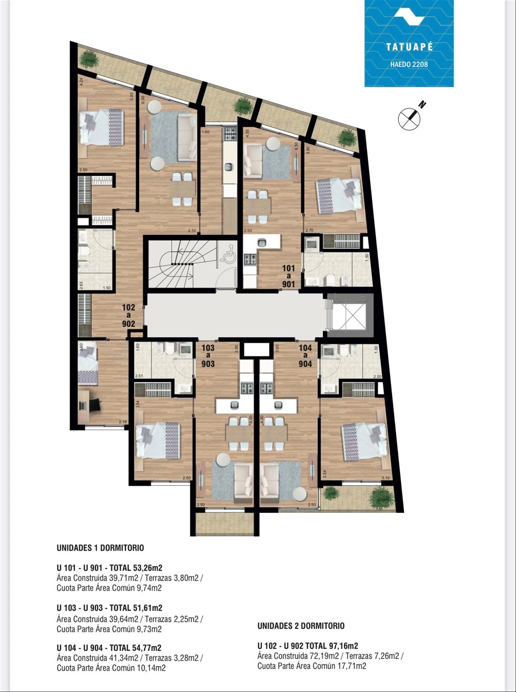 * Las superficies de los apartamentos incluyen muros divisorios hasta su eje, ductos, terrazas, balcones, prorrateo de área común, circulación vertical exclusivamente de planta.