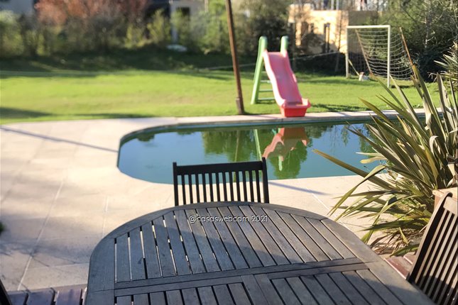 Hermosa casa construida por Arq Bazurro, en barrio con seguridad 24 h. Estar con estufa leña mirando al fondo, cocina definida, comedor diario. Escritorio en planta baja, toillette, 2 terrazas muy disfrutables conectadas al amplio fondo con piscina. Barbacoa muy cálida.En planta alta, 3 dormitorios, principal con baño en suite, amplio vestidor y terrazas. Calefacción central a gas. Garage cerrado para dos autos.Gastos comunes $ 15.000