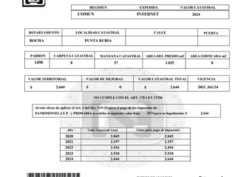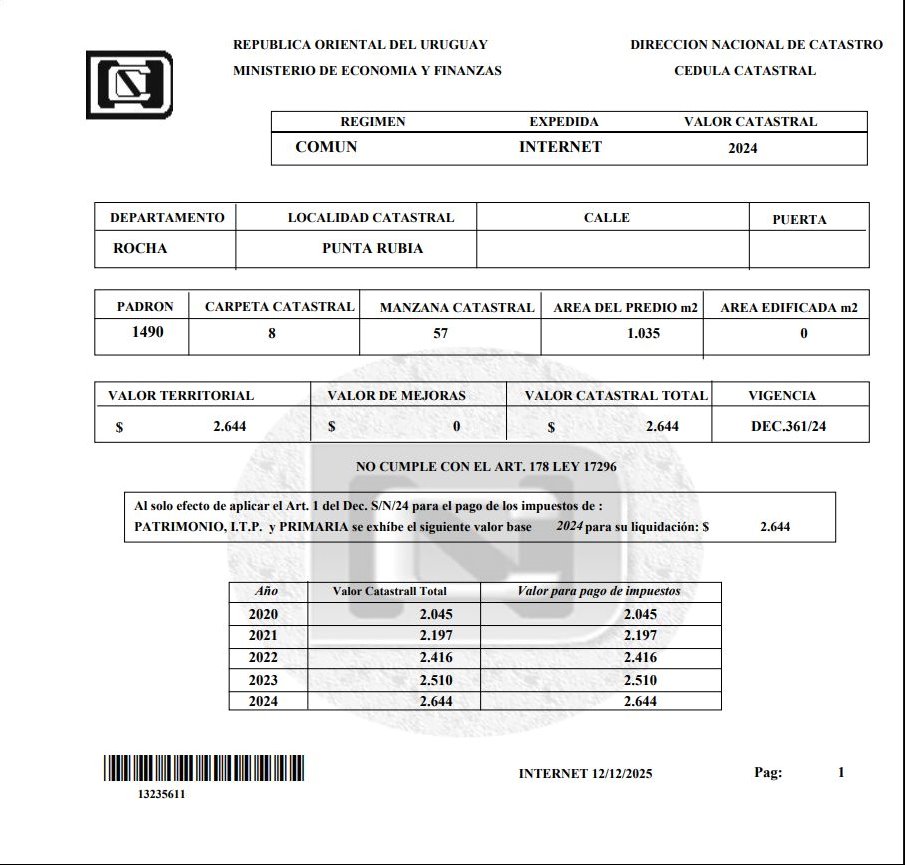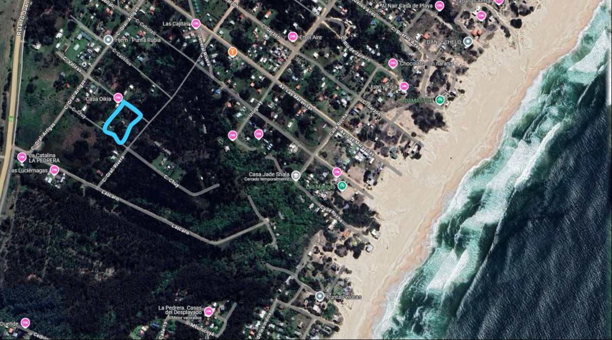 NIKO FORTUNA INMOBILIARIA VENDE:Terreno en Venta en Punta Rubia – 1.035 m² en Calle ValizasExcelente oportunidad en una de las zonas con mayor crecimientoturístico de Rocha.Terreno conformado por tres solares unidos en un mismo padrón, con un frente total de 27,60 metros sobre calle Valizas, en Punta Rubia. Con una superficie total de 1.035 m², es una opción ideal para el desarrollo de un proyecto turístico, ecológico o residencial, a pocos minutos de la playa y del movimiento de La Pedrera, pero con la tranquilidad propia del entorno natural de la zona.Características destacadas:Frente amplio: 27,60 metrosTres solares en un solo padrónSuperficie total: 1.035 m²Zona en crecimiento, con excelente potencialCondiciones de venta:Documentación al díaAcepta bancoAcepta permutaPosibilidad de financiaciónComisión inmobiliaria: 3% + IVAPara más información o coordinar una visita, contactarse a través del número de contacto.