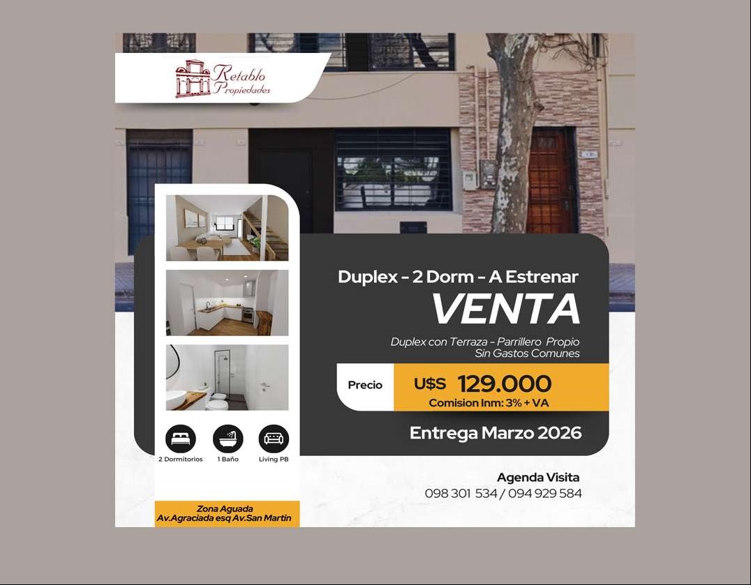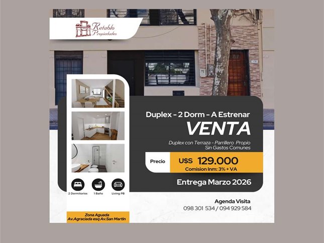 Divino Apto tipo duplex - Con terraza y parrillero propioMuy luminoso - Al Frente - 100Mtrs totalesA estrenar - Entrega Marzo 2026Muy cerca facultades de Medicina y Quimica Apto en 2 niveles y terraza en un tercer nivelLiving -Comedor al frente , amplio y luminosoCocina integrada con lindos placares bajo mesadaDos(2) dormitorios en 1er piso , ambos comodosUno de los dormitorios con salida a terrazaHermosa terraza con parrillero de uso exclusivoPrecio : U$S 129.000Sin Gastos Comunes Sin Gastos de ingresosComision inm 3% + IVANo deje de verlo!!Consultas o agendar visitas