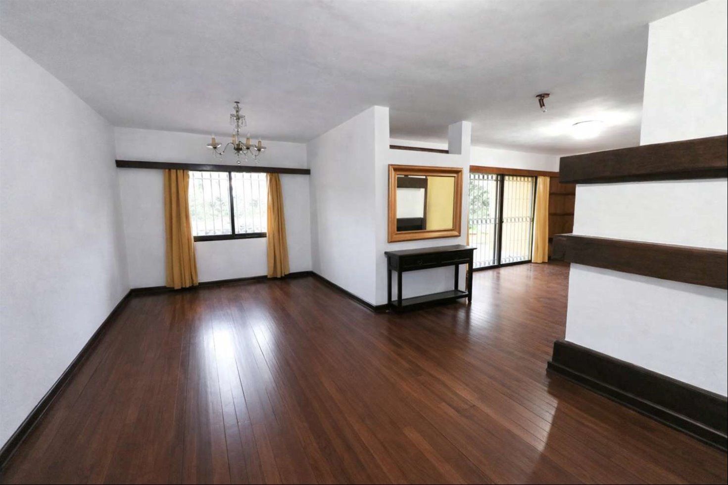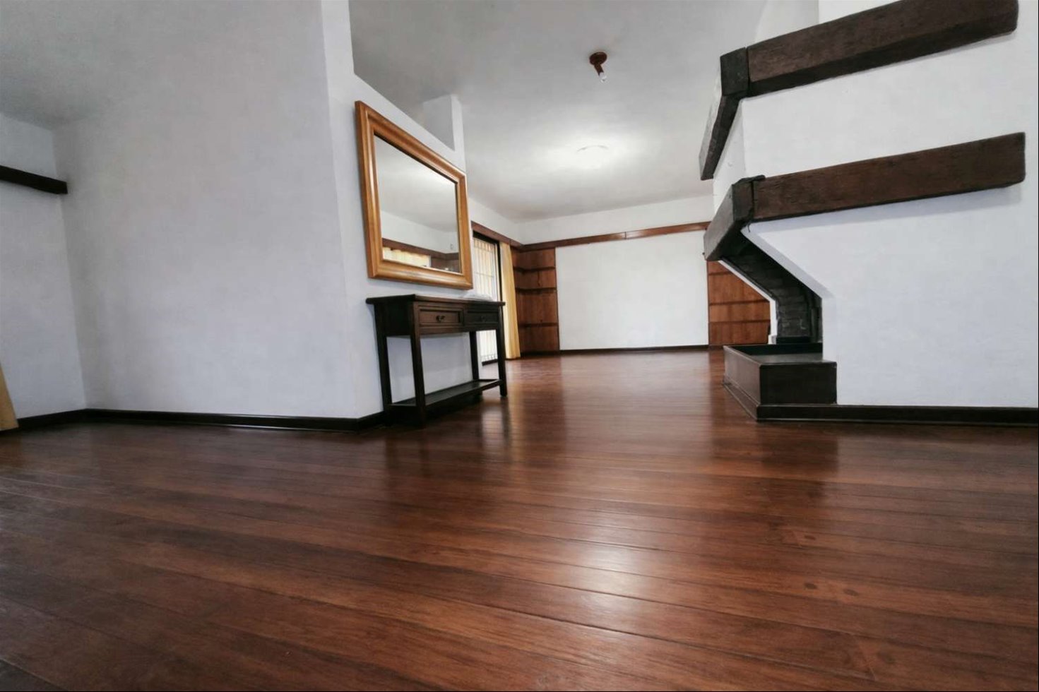 ZONA RESIDENCIAL. Recibidor y living con comedor en 2 ambientes con piso de lapacho tarugado con estufa de leña