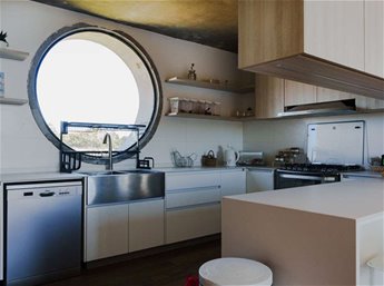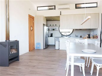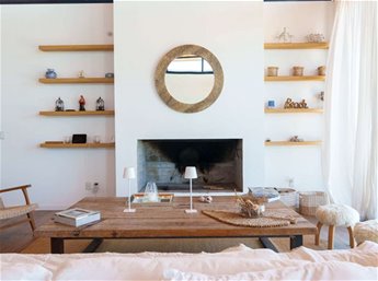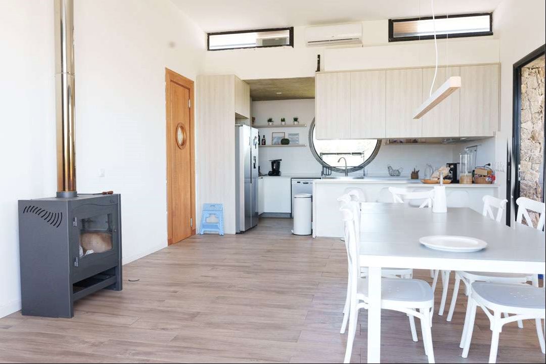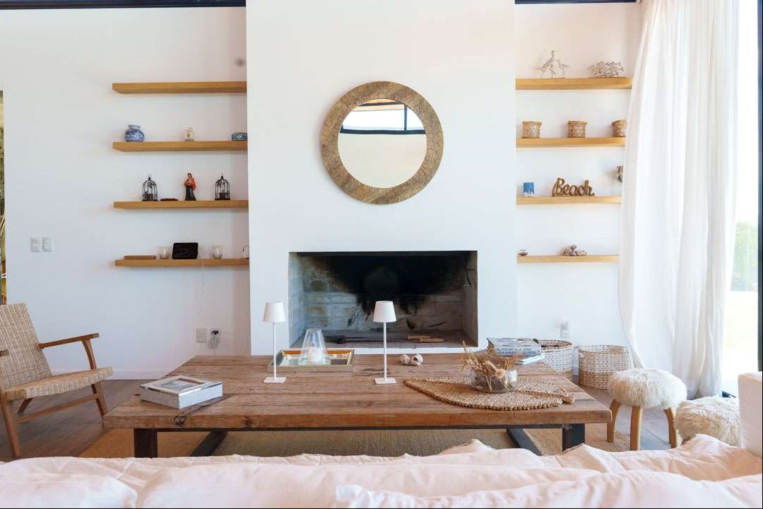 Hogares: Chimenea de material en el living y estufa de alto rendimiento Ñuke en el área de cocina.
