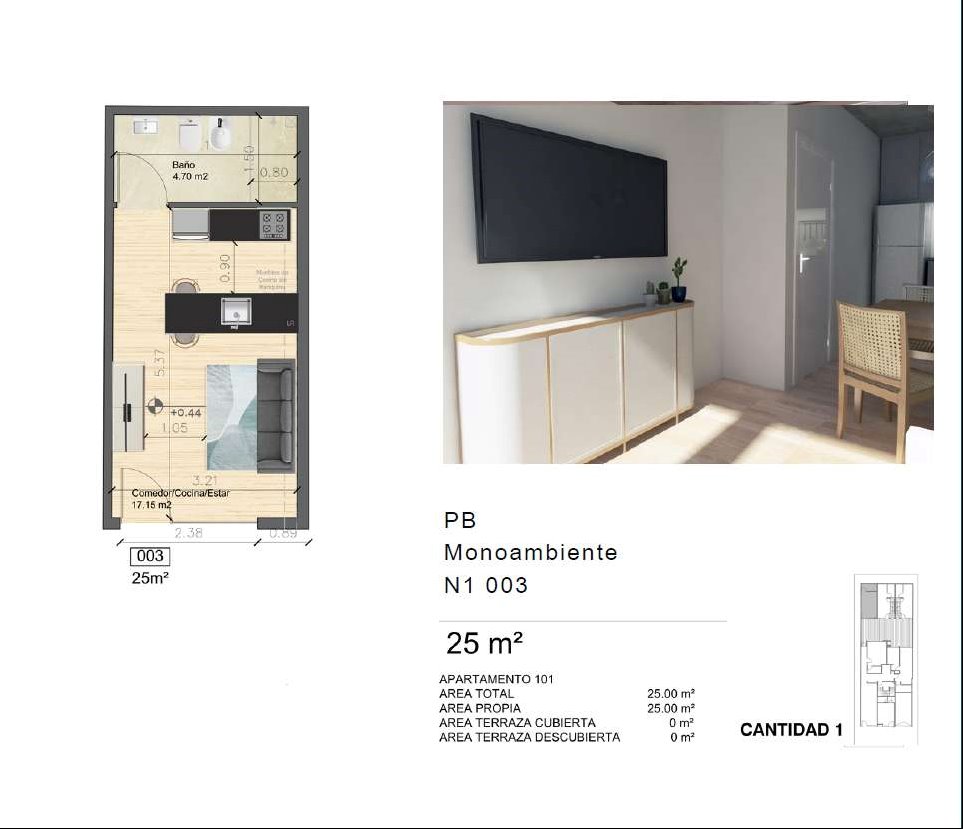 Apartamento a estrenar en proyecto en construcción en pleno Centro de Montevideo. Esta unidad de 25 m² es un monoambiente con cocina definida y un baño. Su orientación al Este y disposición al contrafrente garantizan luz natural y tranquilidad. El edificio cuenta con vigilancia 24 horas y excelentes áreas comunes, incluyendo barbacoa y lavadero. La calefacción es por aire acondicionado split y se aceptan mascotas, lo que lo convierte en una opción atractiva para diversos perfiles de inquilinos. Ideal para inversores que buscan una propiedad con alta rentabilidad en una zona de gran demanda. La ubicación privilegiada en el corazón de Montevideo ofrece fácil acceso a servicios y transporte, a pocas cuadras de la Intendencia de Montevideo, el Banco de Seguros y la Plaza del Entrevero, puntos de referencia clave de la ciudad. El edificio, de 5 plantas, se desarrolla bajo el régimen de propiedad horizontal, asegurando una administración organizada y el mantenimiento de un estado muy bueno. Este monoambiente representa una oportunidad de inversión segura en un mercado dinámico, con potencial de apreciación y una demanda constante de alquileres en el centro de la capital uruguaya. La posibilidad de adquirir una propiedad en construcción permite asegurar el precio y adaptarse a las fases del proyecto. Su tamaño compacto y su diseño moderno lo hacen funcional y atractivo para inquilinos que valoran la practicidad y la ubicación.